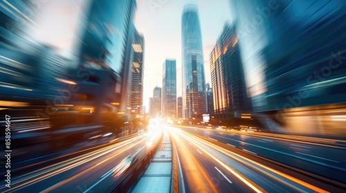 © Seksan, Fototapeta premium Business district skyline with busy traffic, car lights creating trails, evening rush hour, dynamic cityscape, high resolution and vibrant