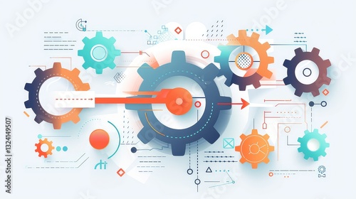 © ARUKA, Obraz premium Business Efficiency Infographic. Modern illustration with gears, arrows, and abstract data on a soft gradient background, ideal for corporate presentations. AI generated image.