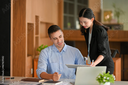 © bongkarn, Obraz premium Business female manager shows business informations via tablet.