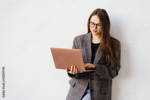 © F8 \ Suport Ukraine, Naklejka premium Business, finance and employment, female successful entrepreneurs concept. Confident smiling businesswoman, office worker in white suit and glasses using laptop, help clients