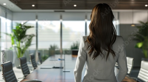 © Cloudyew, Obraz premium Business girl from behind in a conference room setting.