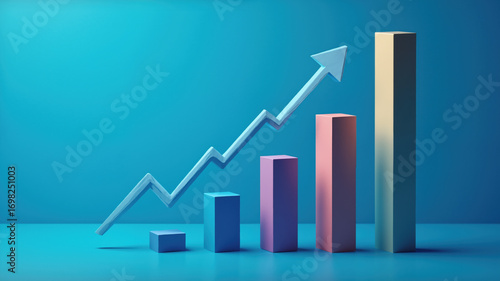 © Konstantin, Fototapeta premium business graph with arrow . Steps of bar chart on blue background , business growth and development , financial data