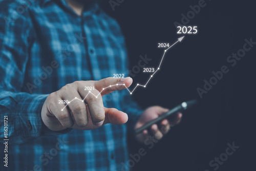Fototapeta premium 2025 business growth, Businessman holding growth graph a year 2025 of business and data analysis. 2024 to 2025, Development to success in year 2025. challenge and business strategy in new year.