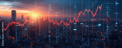 © thanawat, Fototapeta premium Business growth concept with data analytics graph overlaying a stunning city skyline at sunset, illustrating financial progress.