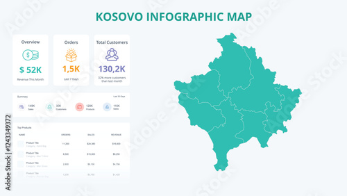 © bakarali, Naklejka premium Business Growth Infographic Map of Kosovo. Orders, Customers, Sales Overview & product Infographic Map of Kosovo. Easy to edit