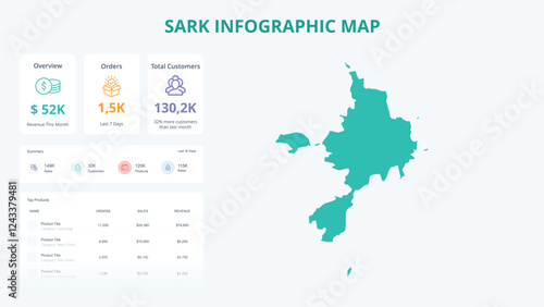 © bakarali, Naklejka premium Business Growth Infographic Map of Sark. Orders, Customers, Sales Overview & product Infographic Map of Sark. Easy to edit