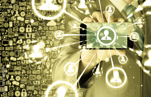 © Natalia Merzlyakova, Obraz premium Business Hand holding a phone show the social network