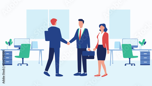 © Pixel Empire, Obraz premium Business handshake in office with woman and desks and computers and plants and window background scene