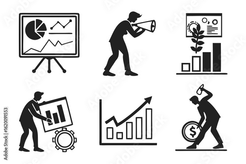 © NURNEHARAKTER, Obraz premium Business Icons Illustrating Growth Communication and Financial Management.