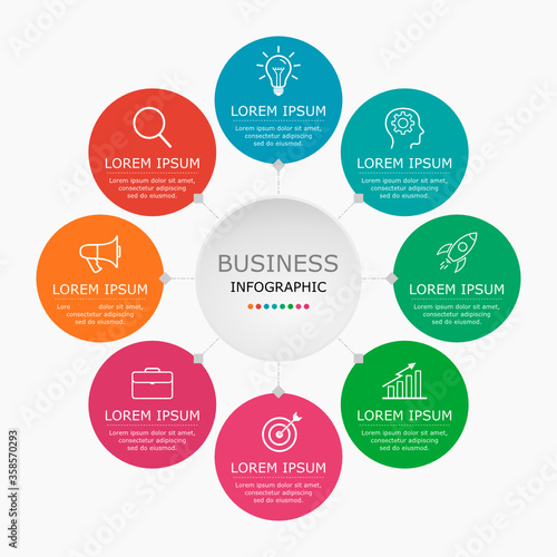 Fototapeta premium Business infographic Vector with 8 steps.Used for presentation,information,education,connection,marketing, project,strategy,technology,learn,brainstorm,creative,growth,abstract,stairs,idea,text,work.