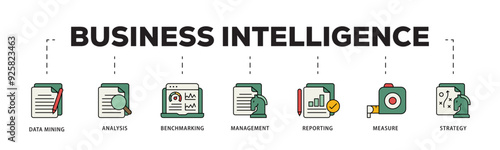 © AFD, Fototapeta premium Business intelligence icon infographic illustration concept with icon of data mining, analysis, benchmarking, management, reporting, measure, and strategy icon live stroke and easy to edit