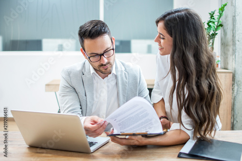 © Bojan, Fototapeta premium Business man and woman sitting at desk talking about reports and finance at office