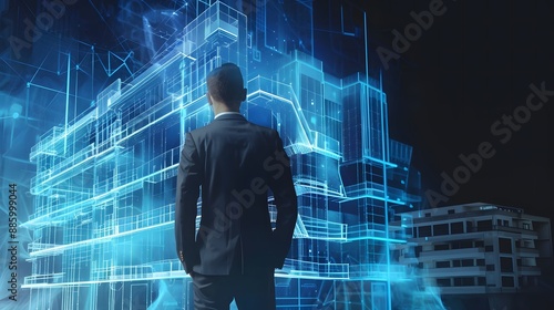© ShinneProject, Obraz premium Business man demonstrating a blue hologram of a modern architectural building, emphasizing investment in real estate