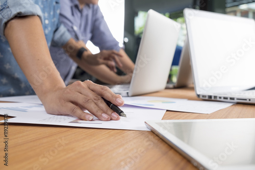 © successphoto, Fototapeta premium Business man hand pointing at business document during discussion at meeting
