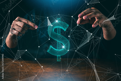 Fototapeta premium business man hand show something us dollar virtual sign dark blackground...