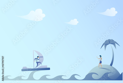 Naklejka premium Business Man Sailing On Boat Looking With Binocular Businesswoman On Island...