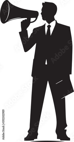 Obraz premium Business man speaking trough megaphone speaker vector silhouette black vector illustration on a white background, SVG