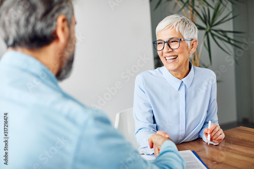 © Lumos sp, Fototapeta premium business man woman office work hand shaking meeting agreement
