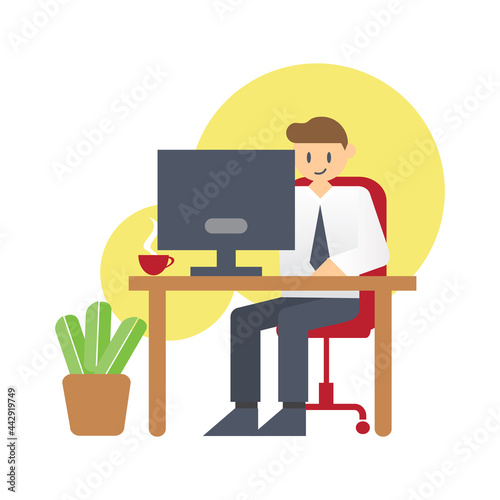 © rabbizz77, Obraz premium Business man working on computer at the office Vector flat style illustration