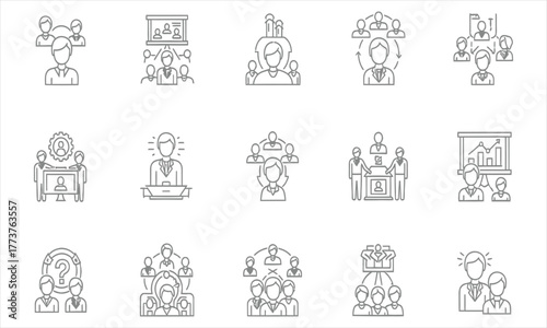 Fototapeta premium Business management and leadership icon set illustrating concepts of corporate hierarchy, teamwork, and human resources