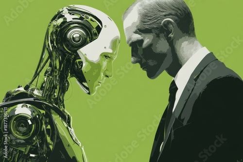 © Georgii, Fototapeta premium Business meeting between human and AI robot illustration in a modern corporate setting