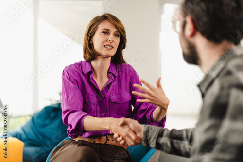 © Nikola Spasenoski, Obraz premium Business meeting between two professionals discussing project ideas in a modern office space during the afternoon