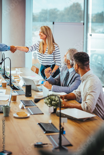 © Dragana Gordic, Obraz premium Business Meeting with Colleagues Shaking Hands in Office