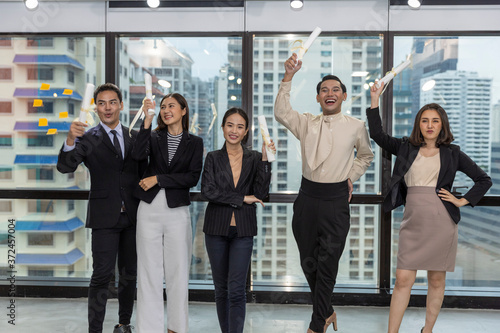 Naklejka premium Business office workers celebrate a great acheivement together after major...