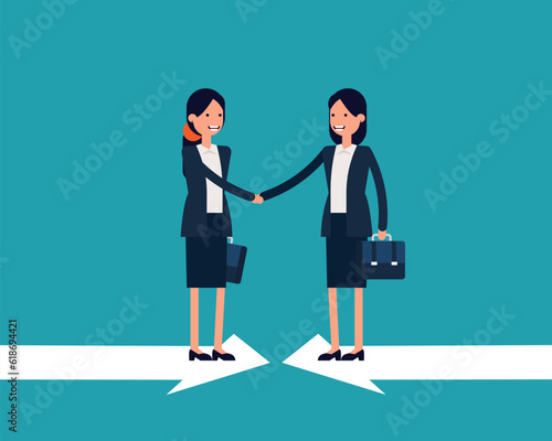 Fototapeta premium Business partnership shaking hands on opposite arrows. Vector illustration...
