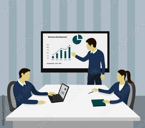 © Ludra Design, Fototapeta premium Business people are presenting on how to develop a business. Making strategies and plans in business. flat design elements. Teamwork in discussing and creating new ideas, flat vector illustration..