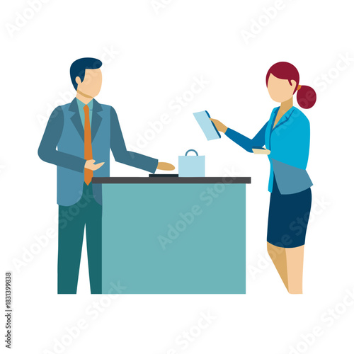 Obraz premium Business people at a reception desk interacting with a clerk, handing over documents for service.