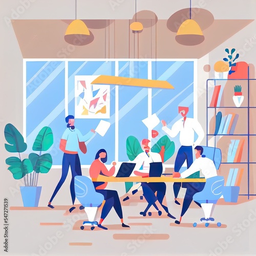 © AkuAku, Fototapeta premium Business people characters working in the office. Minimal co working space. Group of working office employees. Startup 2d illustrated illustration. Team project, brainstorm, teamwork process during
