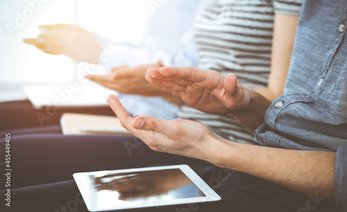 Obraz premium Business people clapping at meeting or conference, close-up of hands. Group of unknown businessmen and women in sunny office
