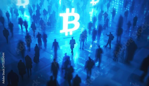 Fototapeta premium Business people executives stand in front of a bitcoin logo.
