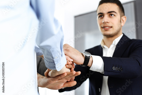 © Iryna, Obraz premium Business people group showing teamwork and joining hands as a circle in modern office. Success concept