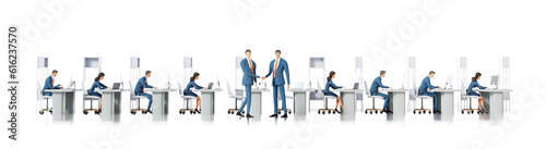 © IRStone, Obraz premium Business people hand shake in office, Team of business people working hard.3D rendering illustration