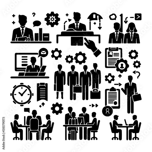 Fototapeta premium Business people icon set with various professions and activities in black silhouette style