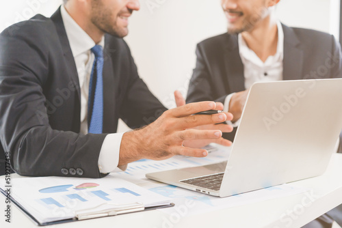Fototapeta premium Business people meeting. Businessman, partnership planning strategy of project, brainstorming with colleague, using device laptop computer analyzing data, discussing document, paperwork at office.