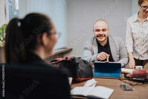 Fototapeta premium Business people meeting in an office, engaging in collaborative discussion, technology, and creative planning. A positive and productive environment.