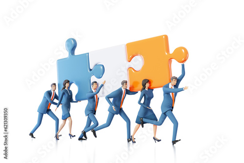 Obraz premium Business people running and caring big puzzle. Work together as team,. help, support idea 3D rendering illustration