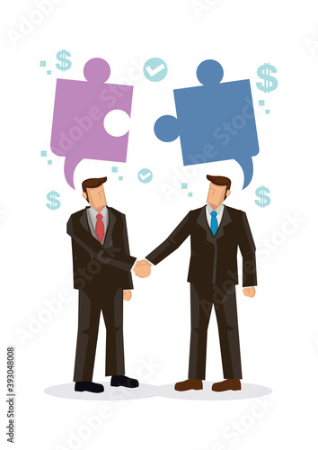 © UncleFredDesign, Obraz premium Business people shaking hands, connecting jigsaw puzzle in their mind.