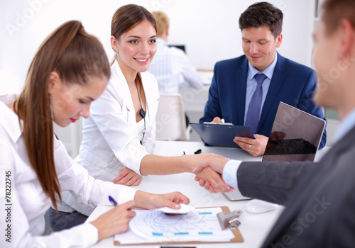 Fototapeta premium Business people shaking hands, finishing up a meeting, in office