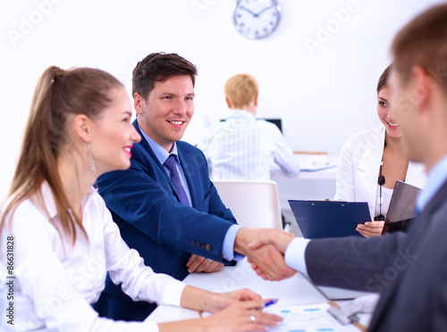 Fototapeta premium Business people shaking hands, finishing up a meeting, in office