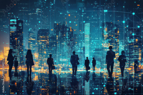 © Jam, Obraz premium Business people stand silhouetted in front of a brightly lit city skyline at night, surrounded by digital elements and a futuristic atmosphere