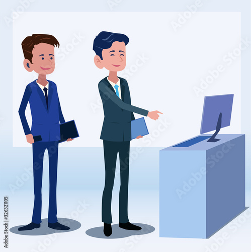 © Chakkree, Obraz premium Business people talk about stock market and investment Illustration vector On cartoons style Board view background