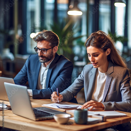 Fototapeta premium business people working and discussing in a modern office using smartphones laptops and tablets, ai generated