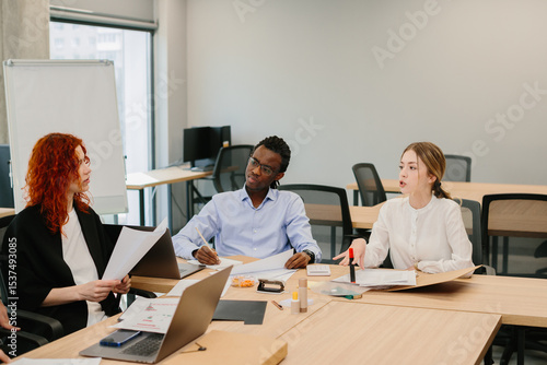 Fototapeta premium Business people working together on a project in modern office: discussing...