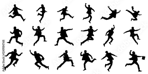© paulmalaianu, Naklejka premium Business peoples in suit jumping in the air set. Vector illustration.