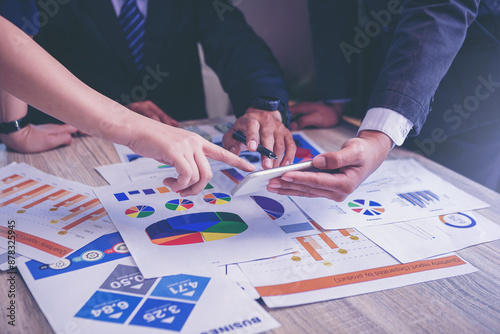 © Panumas, Obraz premium Business peoples using smartphone, meeting to discuss the situation on stock market, talking business plan, marketing for investment. Selected focus