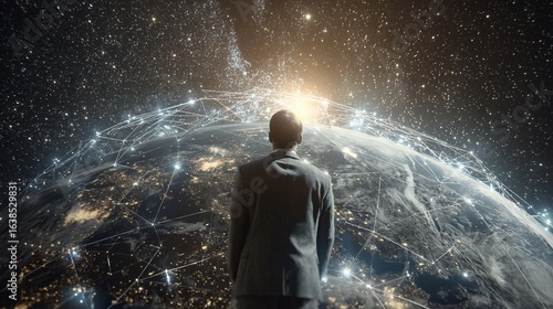 © mbah, Obraz premium Business Person Observes Global Network and Data Connections from Earth's Surface